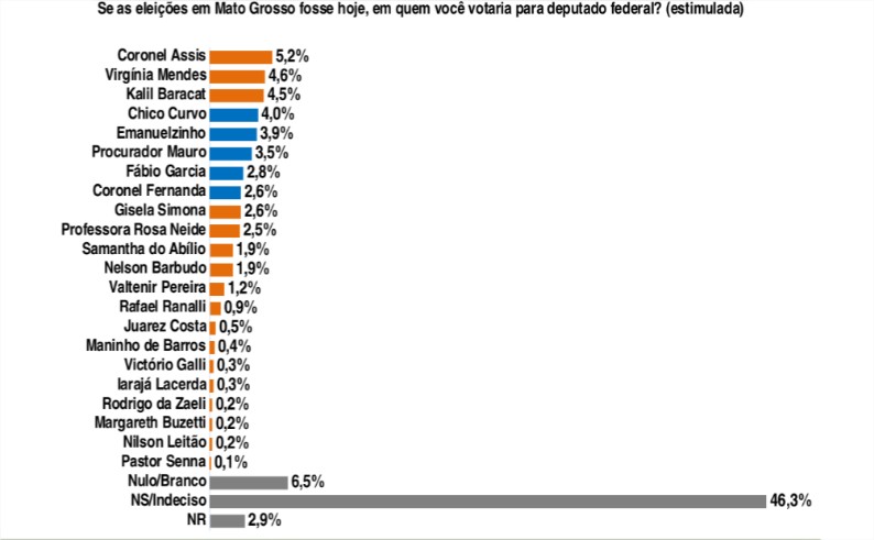 O Instituto IDOC, empresa ligada ao Portal O Documento e TV Cuiabá, foi às ruas e aplicou 1.000 entrevistas presenciais na Capital e Várzea Grande entre os dias 29 e 30 de novembro, e 1º de dezembro. Pela sondagem, o deputado federal, Coronel Assis (União), lidera disputa à Câmara Federal com 5,2% das intenções de voto.