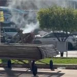 Mulher derruba poste, quebra semáforo e fica presa ao carro no Tijucal; veja vídeo