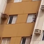 Criança se pendura em tela de apartamento no alto do oitavo andar em prédio...