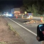 Casal colide com bezerro, cai de moto e é atropelado por caminhão