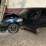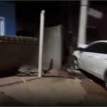 Corolla perde controle, derruba área de casa e bate em poste; veja vídeo