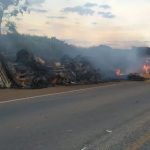 Carreta carregada com farelo de milho pega fogo ao tombar na BR-163