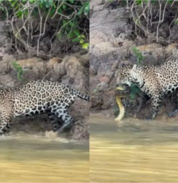Onça-pintada é flagrada capturando sucuri em rio no Pantanal; veja vídeo