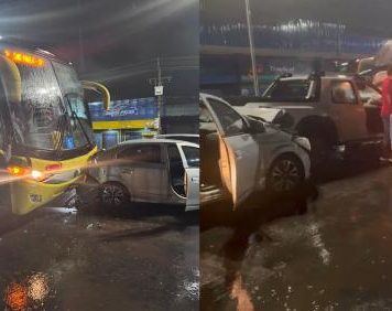 Ônibus perde controle e atinge 4 veículos em Cuiabá; vídeo