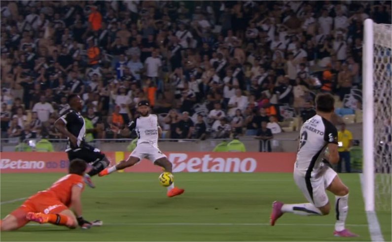 O Vasco sentiu, e a sua defesa começou a errar em posicionamento. Um chutão de Martínez encontrou mais uma vez Yuri Alberto livre nas costas de Veiga. O atacante, mas desta vez pressionado por PH, que veio em desabalada carreira para tentar bloquear, chutou por cima.