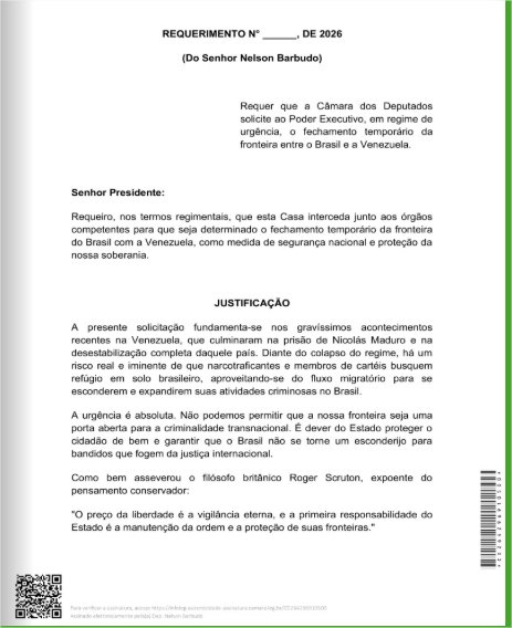 No texto do requerimento, Nelson Barbudo também cita o filósofo britânico Roger Scruton, ao reforçar que a proteção das fronteiras é uma das responsabilidades centrais do Estado. Para o deputado, o debate vai além da diplomacia internacional e envolve diretamente a preservação da ordem, da segurança e da vida dos cidadãos brasileiros.