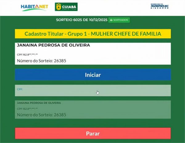 Três horas após fazer o sorteio ao vivo por meio de seu canal no YouTube, a Prefeitura Municipal de Cuiabá divulgou a lista em ordem alfabética dos 1.000 contemplados para a última etapa da seleção que entregará 692 unidades do programa Casa Cuiabana. O sorteio utilizou os números da última extração da Loteria Federal.