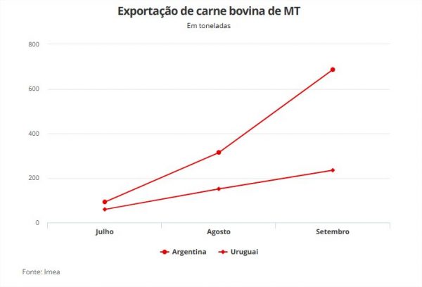 Em agosto, foram 314 toneladas de carne bovina de Mato Grosso para a Argentina, enquanto em setembro o número saltou para 686 toneladas, uma alta de 118,47%. Os dados são do Instituto Mato-grossense de Economia Agropecuária (Imea).