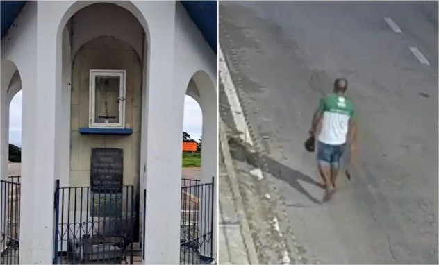 Nas imagens, registradas ainda no sábado, um homem é flagrado passando pelas imediações da capelinha com um machado em mãos – objeto que teria sido usado para depredar o local. O caso segue sob investigação. (Primeira Página)