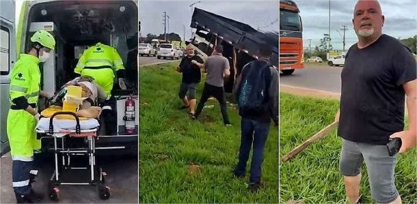 O conflito físico aconteceu a poucos metros de uma colisão envolvendo um Hyundai HB20 prata, um caminhão DAF XF 105 e uma carreta Volvo FH 440. Embora o acidente tenha deixado três feridos, a atenção de quem passava pelo trecho foi desviada pela pancadaria entre os comunicadores.