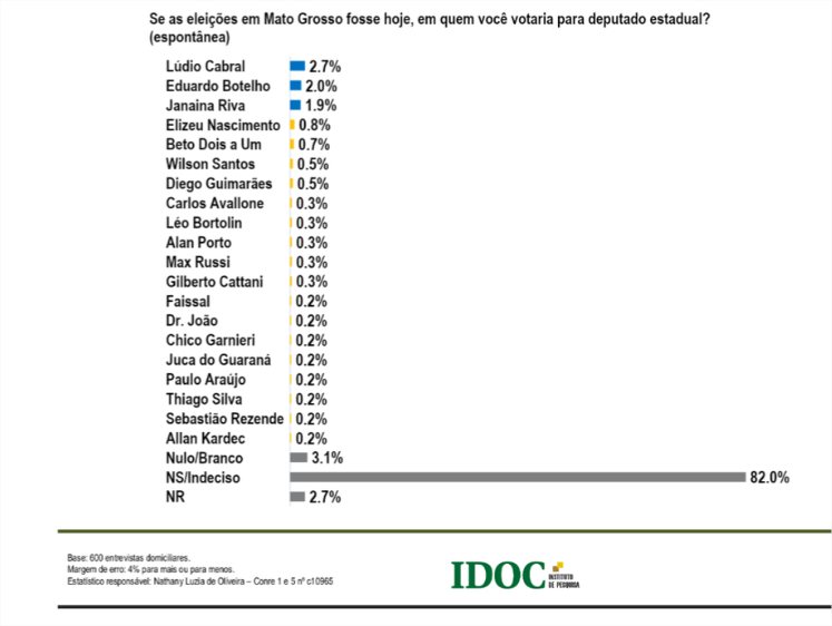 Os ex-prefeitáveis Lúdio Cabral (PT) e Eduardo Botelho (União Brasil) lideram com folga pesquisa para deputado estadual, em Cuiabá, com 9,8% e 6,3%, respectivamente. O Instituto IDOC projetou, com base no provável coeficiente eleitoral de 2026, a eventual votação deles apenas na Capital. Neste cenário localizado, Lúdio deve chegar a 22 mil votos, e Botelho em aproximadamente 18 mil.