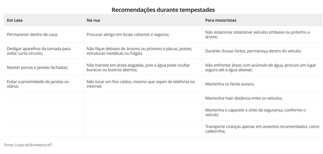 Diante do risco provocado por chuvas intensas e ventos fortes, o Corpo de Bombeiros Militar de Mato Grosso orienta a população a adotar medidas preventivas para evitar acidentes, como: