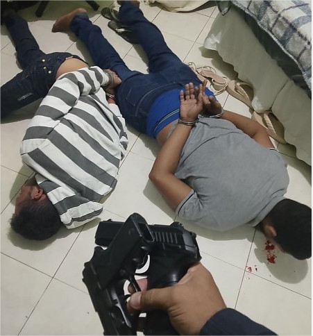 Dois homens, de 24 e 27 anos, foram presos acusados de cometer o crime. Um integrante da quadrilha fugiu pulando o muro dos fundos da casa. Na ação, as equipes apreenderam uma arma de fogo e um simulacro.