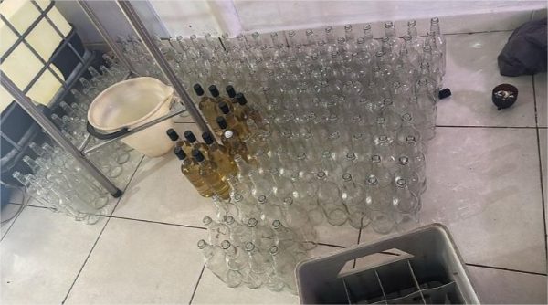 No local, os policiais da Decon e os fiscais da Vigilância Sanitária constataram a veracidade das informações, encontrando mais de 500 garrafas vazias, aguardando para ser envasadas, mais de 30 rolos de rótulos de marcas de bebidas conhecidas no mercado, três bombonas de mil litros de bebida destilada (aguardente), além de diversos produtos químicos e naturais que eram misturados na bebida para dar aroma e cor.