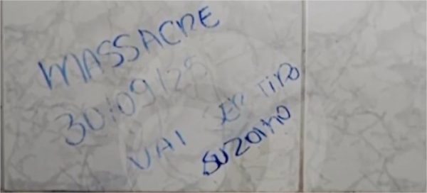 Pichações no banheiro feminino da Escola Estadual Padre Ernesto Camilo Barreto, em Cuiabá, ameaçavam um “massacre” na unidade nesta terça-feira (30). As mensagens causaram medo entre alunos, funcionários, professores e direção. Um boletim de ocorrência foi registrado na Polícia Civil. O caso veio à tona no Programa do POP, desta quarta-feira (1º).