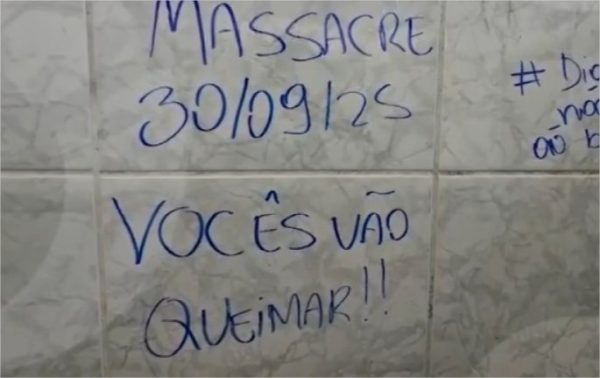 Segundo o boletim, funcionárias da limpeza localizaram pichações indicando a possibilidade de um massacre na unidade. Entre as frases escritas estavam: “#DigaNãoAoBullying”, “30/09/2025 vocês vão queimar”, além de “Massacre 30/09”, “vai ser igual Suzano”, em referência ao massacre escolar ocorrido em 13 de março de 2019, na Escola Estadual Professor Raul Brasil, no município de Suzano, no estado de São Paulo.