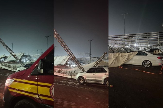 A estrutura cedeu após uma forte rajada de vento que avançou sobre o autódromo junto com um temporal de areia. Minutos depois, a região também foi atingida por chuva intensa, o que agravou o cenário e deixou o local alagado em alguns pontos.