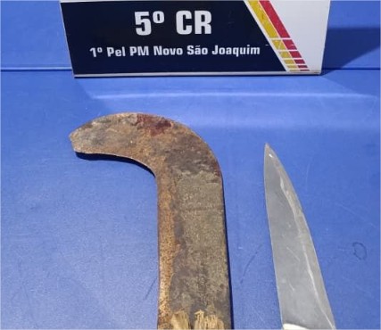 Durante a ocorrência, os policiais apreenderam uma foice e uma faca, utilizadas na agressão.