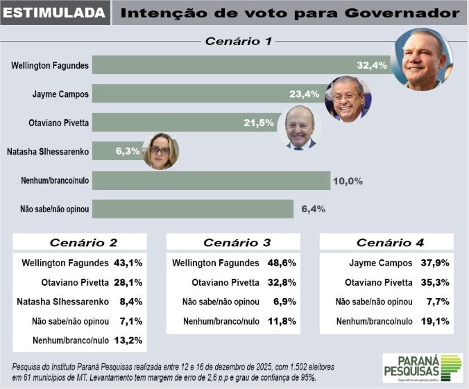 No Cenário 1, incluindo quatro pré-candidatos, Wellington Fagundes aparece com 32,4% das intenções de voto. Em segundo lugar está o senador Jayme Campos (União Brasil), com 23,4%, seguido pelo vice-governador Otaviano Pivetta (Republicanos), que alcançou 21,5%. Jayme e Pivetta estão tecnicamente empatados.